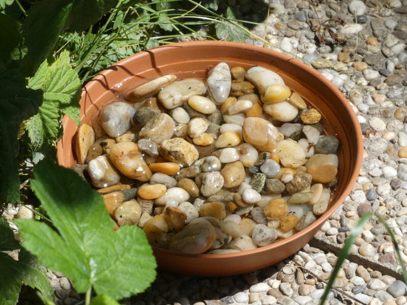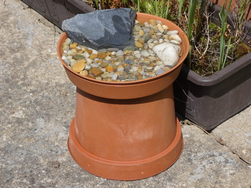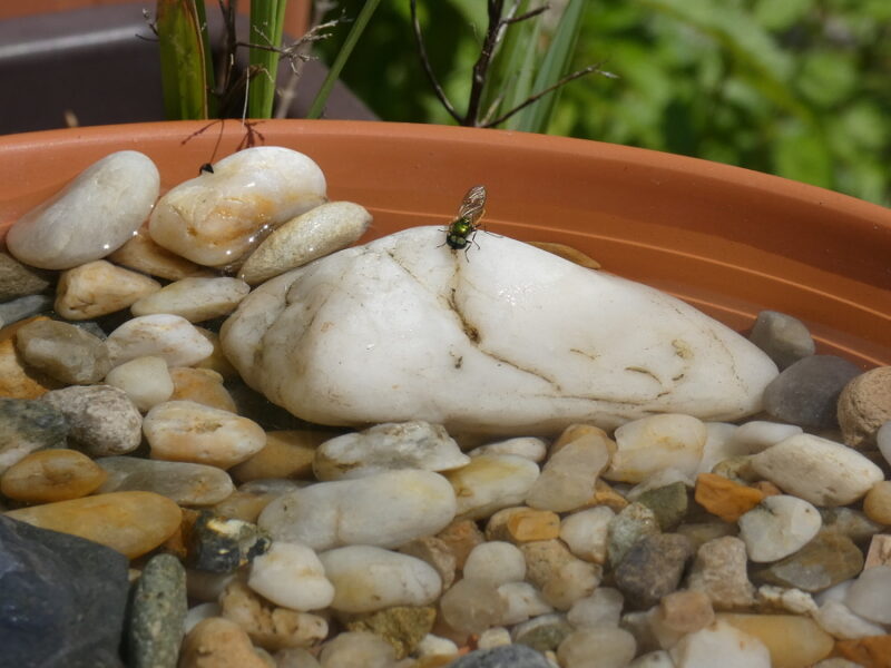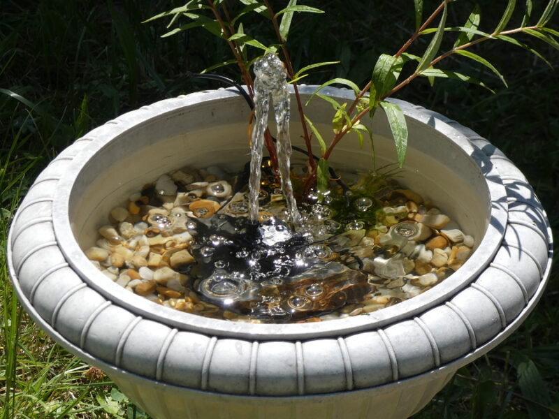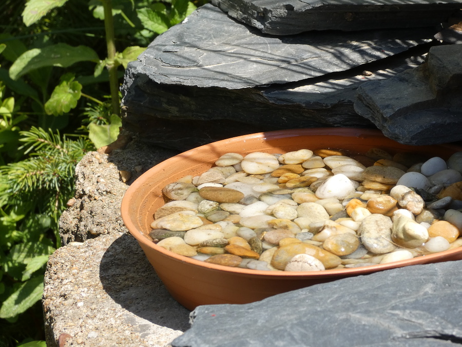 Kdo si chce víc pohrát, tak je vhodné pouvažovat o menší fontáně. I tu je možné jak zakoupit v hobby marketech, tak je možné si ji vyrobit doma. Stačí k tomu větší nádoba, malé kamínky, ideálně dvě vodní rostliny (jednou z nich by měl být leknín) a čerpadlo, které se v dnešních možnostech dá pořídit za pár stovek. Cirkulující voda je méně náchylná na zkažení, a zároveň se i v tropických dnech neohřeje tolik, co stojatá voda. A ještě taková fontána například na terase udělá nějakou tu parádu. O fontánách ale v budoucnu v samostatném článku.